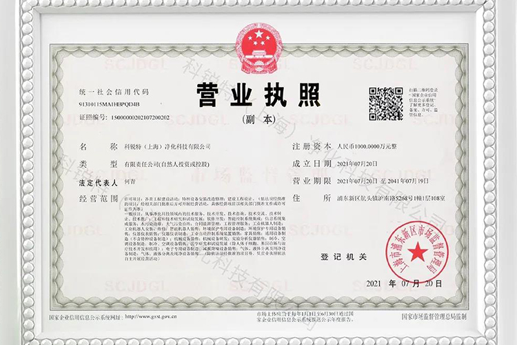 科銳特擁有凈化系統工程設計安裝貳級資質,裝修裝飾工程專業承包貳級資質,機電安裝工程專業承包貳級資質,消防設施工程專業承包貳級資質,工程設計專項乙級資質,環保工程專業承包叁級,鋼結構專業承包叁級,15項專利證書,通過4項國標認證體系,五星級售后服務認證,智慧云潔凈室系統發明專利。(凈化工程)